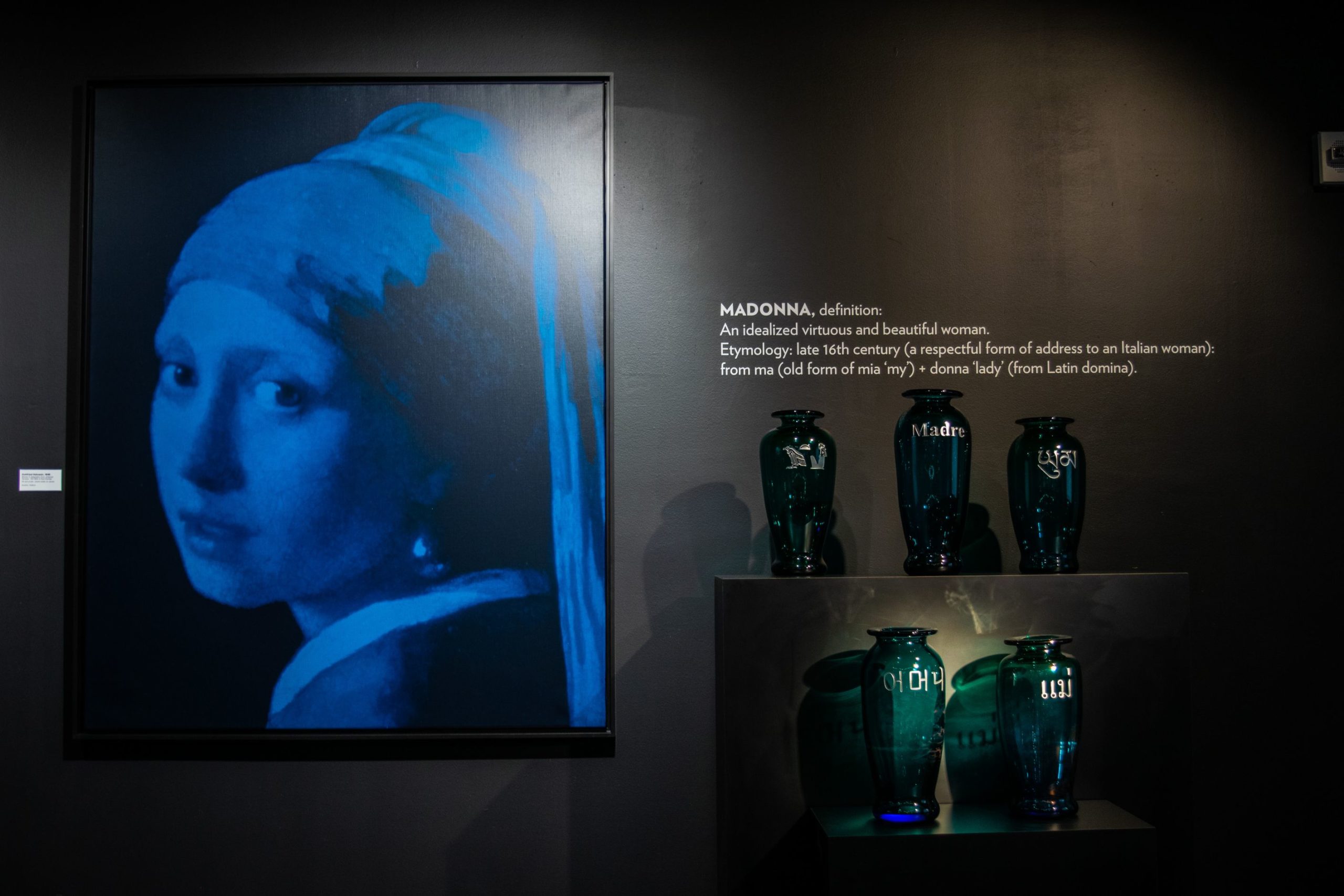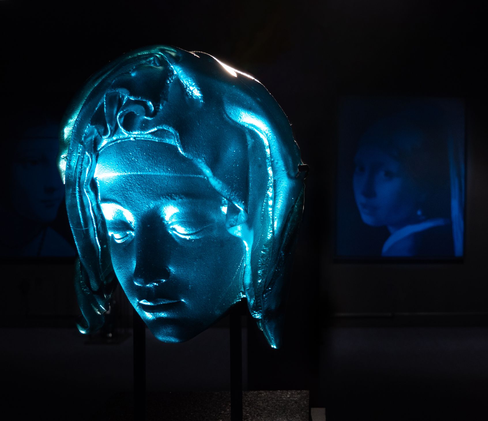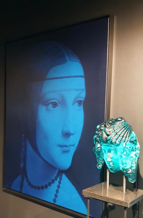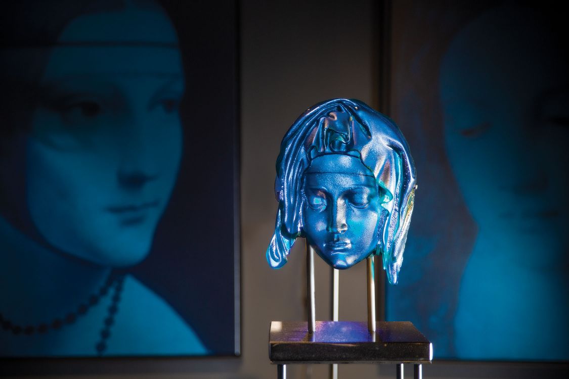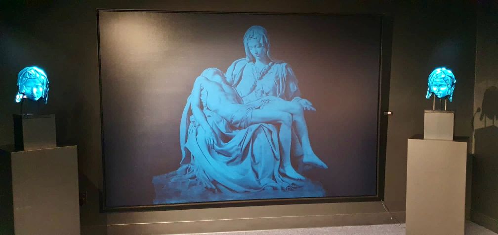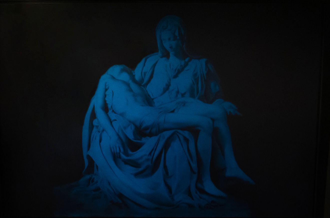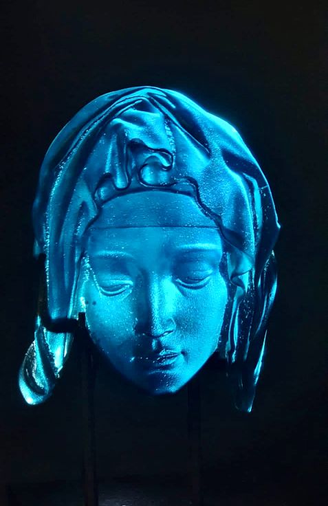 “Blue Madonna” is a collaboration based on the face of Mother Mary in Michelangelo's famous sculpture the Pieta. The Pieta is known for representing the compassion and motherly love Mother Mary shows her son, Jesus.